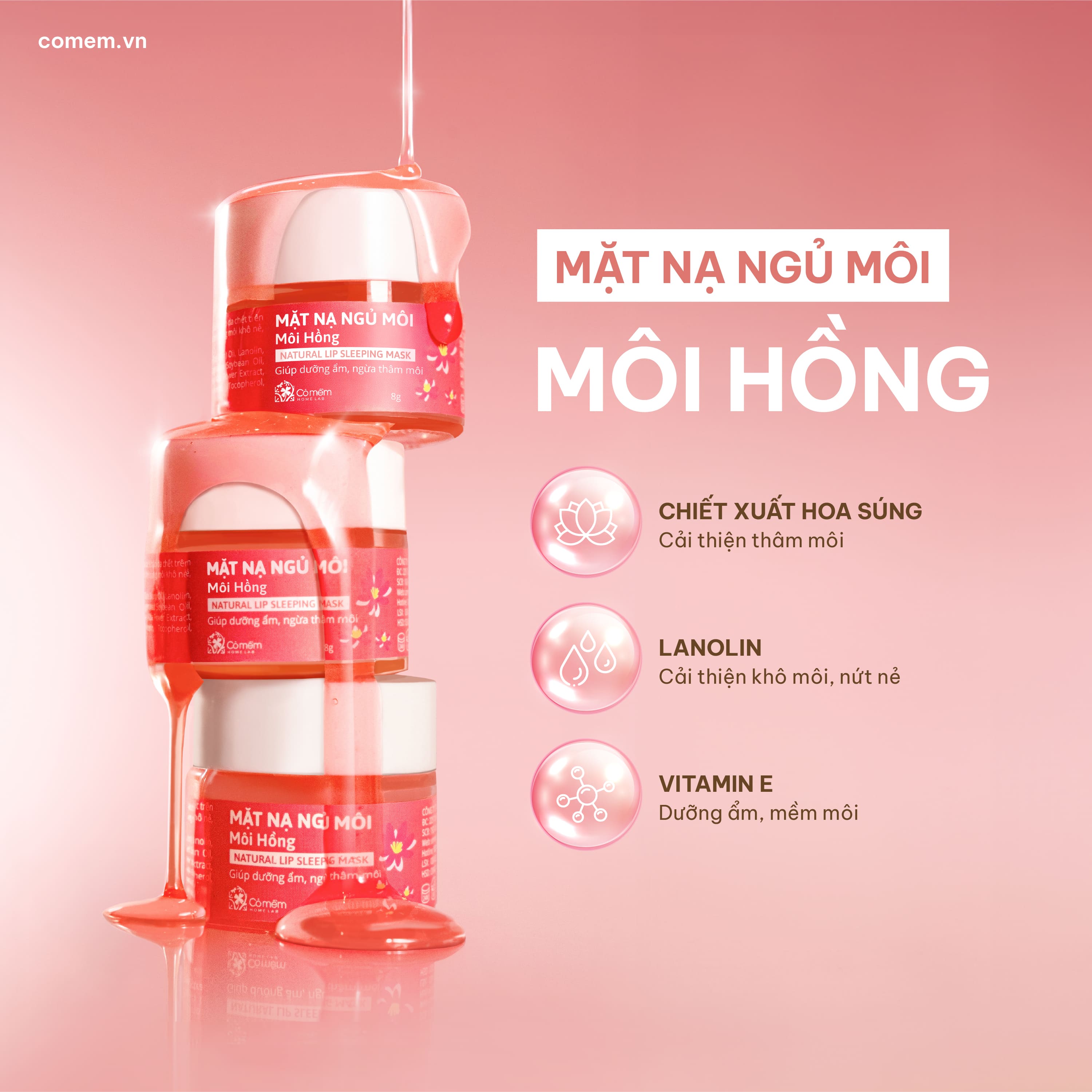 Và mặt nạ ngủ môi hồng chính là giải pháp hoàn hảo để dưỡng môi mềm mịn, hồng hào, tươi khỏe cho các nàng đây. Với chiết xuất từ thiên nhiên như dầu cám gạo, lanolin, chiết xuất hoa súng, vitamin E cùng với hàng hoạt các thành phần khác, mặt nạ ngủ môi hồng giúp tẩy tế bào chết, làm mềm môi và ngăn ngừa thâm môi, dưỡng cho môi ngày dài thêm căng bóng, mịn hồng.